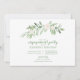 Simples e chique, este design de convite para Festa de noivado de Ivory Watercolor é a maneira perfeita de convidar seus convidados para uma festa para celebrar seu noivado. Apresenta um galho solteiro de rosas pintados com cor d'água de marfim com folhas e folhagem verdes claras na frente. O dorso apresenta um buquê selvagem das flores. Toda a tipografia verde pode ser alterada para ajustado das necessidades de planejamento do seu partido. Tem acessórios para ajustado de qualquer casamento, janto de ensaio, cartões de pedido de damas de honra e muito mais.