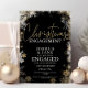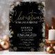Celebre seu noivado em estilo festivo com este elegante convite de festas de Natal preto e ouro. Apresentando estilhaços de neve com efeito dourado, tipografia de na moda e um fundo negro dramático, este convite é perfeito para uma glamourosa celebração de noivados de férias. Personalize com seus nomes, data, local e informações de RSVP para uma reunião mágica sazonal!