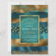 Dourado e teal pinceladas de tinta e festa de noivado de confete. Convite. Esta elegante design apresenta pinceladas em chás e ouro e confete. Seu texto está em um quadro azul teal com borda dourada. É ideal para um noivado de inverno.