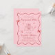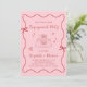 Trendy, convite retrógrado, rosa e festa de noivado vermelha, inspirado por um quadro ondulado adornado com arcos coquetes e ilustrações desenhadas à mão branca de corações, estrelas e uma elegante mesa romântica de casamento, e "Festa de noivado" e os nomes da noiva e noiva em um roteiro lúdico vermelho.