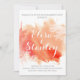 Abstrato de água moderna salpicava coral recife de coral convite de festa de noivado apresentando um talão pintado manualmente com tinta aquosa com textura em tons de laranja e pêssego, recife de coral em branco e texto em branco e cinza. Este elegante e na moda exótico convite de casamento casual é um modelo perfeito e personalizável para o seu casamento de verão na praia costeira. Note que esta é apenas uma imagem de aquarela e não textura real. Para obter melhores resultados, escolha papel com textura.