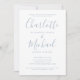 Apresentando nomes de estilo de assinatura, este elegante, moderno e simples convite de festa de noivado pode ser personalizado com suas informações em letras azuis empoeiradas. Projetado por Thisnotme©