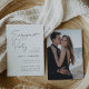 Convide os convidados a comemorar o feliz casal com estes convites modernos e mínimos para festas de noivado, em preto clássico e branco, com uma foto no verso. O design simples apresenta "festa de noivado" em um script manual casual, com os detalhes de seu evento alinhados no canto inferior direito em letras negras suaves. Personalize o verso com uma foto favorita do noivado.