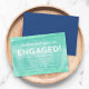 Convite de Festa de noivado moderno com a palavra "Engaged!" em branco contra um plano de fundo de tinta laminado de cor azul-turquesa. O convite tem um lado azul nas costas. Personalize-o substituindo o texto do marcador de posição para adicionar suas informações. Para obter mais opções, como alterar a fonte e seu tamanho/cor ou o espaçamento entre letras, clique no botão "Personalizar". *Observe que a Marca d'água do Zazzle que aparece na visualização de zoom NÃO aparecerá no produto impresso final. © Rosewood e Citrus
