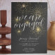 Esse convite minimalista para festas de noivado de caligrafia branca é perfeito para um evento moderno de noivado. Este convite para festa de noivado de design minimalista apresenta fogos de artifício românticos a ouro sobre um fundo preto clássico acabado com caligrafia elegante.