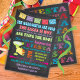 Bonito e colorido Convites à Festa de noivado Fiesta mexicana com faixas brilhantes, tipografia divertida, uma grande margarita e taco num fundo de quadro de chanfro. Então pegue uma bebida fria e salsa quente com este convite incrível. Ilustração desenhada à mão por McBooboo.