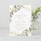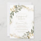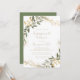 Este convite de festa de noivado de ouro geométrico é perfeito para um evento moderno. A design apresenta uma bela estrutura geométrica dourada com folhas verdes elegantes.