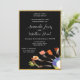Este modelo de convite apresenta um design moderno de comida em garfos sobre preto com uma borda de brilho dourado. Personalize com as informações da sua festa de noivado. Mostrado em um tamanho 5x7, tamanhos maiores ou menores também estão disponíveis.