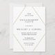 Convites de festa de noivado moderna com um simples design com seus detalhes de evento dentro de forma falsa de diamante geométrico em ouro, sobre fundo branco. Um design minimalista que ainda aparece como chic e na moda.