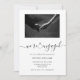 Cartão de convite à festa de noivado simples e moderno, preto e branco, "estamos noivos", com anel de casamento e foto de casais pintados à mão