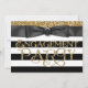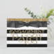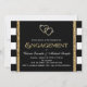 Belo arco preto com riscas brancas e negras ousadas e modernas e fundo com brilho dourado com convite para festa de noivado de script de brilho dourado rico. Este convite de festa de noivado preto e dourado é facilmente personalizado para o seu evento, simplesmente adicionando os seus detalhes no estilo de letra e cor, bem como o texto da sua escolha.
