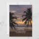 Uma cena de pôr do sol de uma praia impressionante com um céu ouro e roxo, ondas de oceano calmas, e uma silhueta negra de uma palmeira à direita. As matizes quentes refletem sobre a água, criando uma atmosfera romântica e serena — perfeita para um convite de casamento.