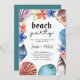 Convite de festas de praia noivado, enquadrado com conchas aquáticas e flores tropicais. A expressão "festa de praia" é escrita à mão e o texto restante é perfeitamente editável.