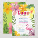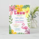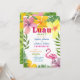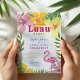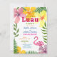 Celebre o amor em estilo paradisíaco com este convite de festa de noivado tropical luau, apresentando flores de hibisco brilhantes, folhas de palmeira e um flamingo rosa. Um layout ousado e festivo destaca os nomes do casal e os detalhes da festa em uma tipografia colorida e divertida. Perfeito para uma celebração de noivado com tema havaiano ou de verão na praia. Totalmente personalizável com seu próprio texto e cores.