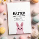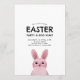 Convite de celebração de Páscoa infantil com coelho rosa com óculos. VOCÊ PODE REMOVER OS ÓCULOS! Fundo com padrão xadrez.
