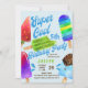 Convite de aniversário de picolé para um rapaz super legal de qualquer idade! O convite é decorado com tipografia divertida e picolés coloridos, originalmente pintados em aquarela. O texto do partido do picolé diz "super legal #th festa de aniversário .. pop e relaxa com [name]". O modelo está preparado para você adicionar seu nome e detalhes da festa. Paleta colorida do arco-íris de verão com azul-turquesa e verde limão.