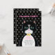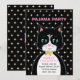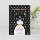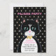 Convite de aniversário de pijama com um lindo gato smoking como mensageiro e estrelas em fundo preto. Todo o texto pronto para ser personalizado.