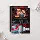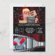 Uma ilustração divertida e moderna de um pano de fundo de cortina vermelho-escuro real; Luzes de fada cintilantes; pipoca; um cachorro-quente; Um bilhete de acesso; um conselho de palmas com giz escrevendo nele e o negativo de um spool de câmera que tem uma postagem de fotos para o aniversariante ou garota. Tudo pode ser personalizado para se adequar à sua celebração especial. Se necessário, pode ser acrescentada ao verso uma nova redação.
