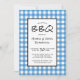 Convide seus convidados para a festa de churrasco no quintal com este convite clássico que apresenta um padrão xadrez azul e branco com texto preto em uma fonte casual.