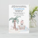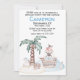 Este convite de festas personalizado apresenta um tema de aniversário de piratas fofo. Uma imagem de um navio pirata é ilustrada no fundo, navegando perto de uma ilha com um tesouro e ouro. Uma pequena gaivota é fotografada em pé na ilha, e uma mensagem em uma garrafa é vista flutuando no mar.