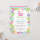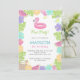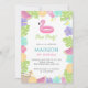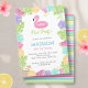 Folhetos tropicais e flores, com frutas e um flamingo fofo flutuante para a festa perfeita de piscina das meninas!