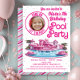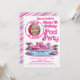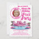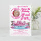 Convite de festa de aniversário de piscina Malibu com linda boia de plástico e espaço para sua foto. Este convite de festa de aniversário da boneca rosa Malibu funciona para qualquer idade, basta adicionar os detalhes do seu evento.