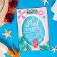 Celebre o verão com esta legal e tropical vista de cima, ilustração da cena da piscina de natação com piscina desenhada à mão, toalhas de praia, folhas tropicais, balão, flutuador e muito mais com piscina com convite de festas de verão da festa de verão de ondas brancas azuis, perfeito para festa de praia, festa de piscina e churrasco.