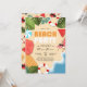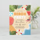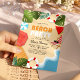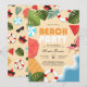 Um divertido Convite de festas de Praia de Aniversário do Verão, com uma praia ilustrativa e arenosa com ondas de água oceânica, melancia, toalha de praia, guarda-chuva, folhas tropicais, bola de praia, cadeira de salão, óculos escuros, flutuadores e tipografia espumante com um padrão no verso.