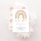 Crie o convite perfeito para o primeiro aniversário com este design do arco-íris mudo moderno. Apresentando cores suaves, com mudas, o design está pingando corações, e apresenta um roteiro com letra de mão, e o dorso é decorado com um motivo de filtro arco-íris. Copyright Elegant Invites, todos os direitos reservados.