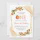 Este primeiro convite de aniversário para os citros apresenta uma estrutura geométrica dourada adornada com laranjas aquáticas. A palavra "UM" aparece em letras maiúsculas laranja com uma cor laranja em vez de "O". Adicione o nome e o aniversário da sua pequena gravata no moderno guião laranja e os detalhes da festa no sans serif preto. A parte traseira da placa é uma forma pastel de laranja que corresponde aos realces de aquarela na parte frontal. Um tema ideal neutro em termos de gênero para uma primeira festa de aniversário de Verão!
