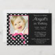 Um convite para festas de aniversario de meninas rosa e preto. Apresentando um padrão de bolinhas preto-e-branco com um gráfico de arco rosa. Adicione facilmente sua própria foto e personalize com suas informações. Para redimensionar e posicionar sua foto, clique no botão "PERSONALIZAR TI". Designs são ilustrações/gráficos impressos em plano - NÃO ARCO REAL.