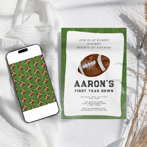 Convite de festas de primeiro aniversario de futebol do primeiro ano de Down Boy Chute o primeiro aniversário do seu novato em estilo com este Convite de festas de primeiro aniversario de primeiro ano de Down! Celebre o seu estatuto de destaque como o "Rookie do Ano" com este convite desportivo, tema de futebol. Adorado com matizes verdes e marrons vibrantes que lembram o campo de futebol, ele estabelece a palco de uma celebração espirituosa. Junte-se a nós para uma extravagância temática desportiva que promete diversão, touchdowns e memórias de abundância. Este convite personalizado captura a essência de um jogo de futebol americano, perfeito para o dia especial do seu filho. Prepare-se para marcar grande e fazer desta primeira festa de aniversário um momento de touchdown vencedor!