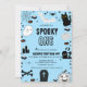 Um cartão de convite de aniversário de menina com um fantasma, gato preto, aranha, morcego, doce, velas, aranha e abóboras em um tema azul de Halloween. "Spooktacular No Convite de Aniversário do Fantasma de Halloween! PERSONALIZE facilmente este design com seus detalhes!" afirma o texto. Se você exigir ITENS CORRESPONDENTES, consulte nossa coleção ou compro correspondente.