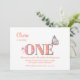 convite de festas de pêssego bonito e primeiro aniversario rosa com texto cor de pêssego/laranja mole e o número UM exibido em um tom de cor de rosa suave formando-se um tom de pêssego, e decorado com flores cor-de-rosa, juntamente com uma bela borboleta rosa penteada e suave colocada no E.