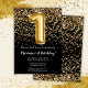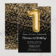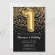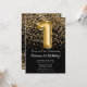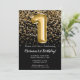 Convite de festas preto e primeiro aniversario de ouro elegante para uma menina de 1 ano com escrevendo de escrita elegante e balões de folha divertida.