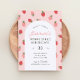 Convide amigos e família para celebrar o dia especial do seu pequeno dia com este adorável convite de aniversário, com morangos ilustrados e confete.