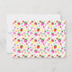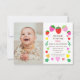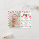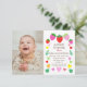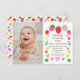 No lado esquerdo deste belo convite colorido está uma foto que você pode personalizar com a foto da sua menina, e à direita o texto diz "Sandie está transformando um em nós para celebrar". Você pode personalizar o nome, a data, o endereço e os detalhes de rsvp. O texto é amarrado por morangos, folhas e corações coloridos em vermelho, rosa, amarelo e verde. As costas mostram morangos coloridos e padrões cardíacos de amor.