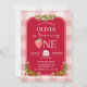 Celebre seu doce primeiro aniversário com esse adorável convite de festas de primeiro aniversario de morango vermelho. Este convite apresenta um design de morango giro e um modelo personalizável. Peça agora e prepare-se para uma festa de diversão!