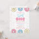 É um cartão de convite de aniversário "Doce Um". Tem aspersão de cor pastel e rosquinhas bonitinhas e doces. Perfeito para a primeira festa de festa de aniversário das meninas. Ele tem texto de tipografia divertido e todo texto aqui é facilmente personalizável.