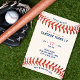 Convite para primeiro aniversario de baseball / softball branco e azul vermelho. Personalize-o com os detalhes da sua festa de domingo. Excelente para fãs ou atletas desportivos.