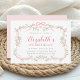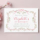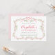 Este primeiro convite de aniversário apresenta um quadro floral cor-de-rosa e verde, adornado com borboletas e fitas.