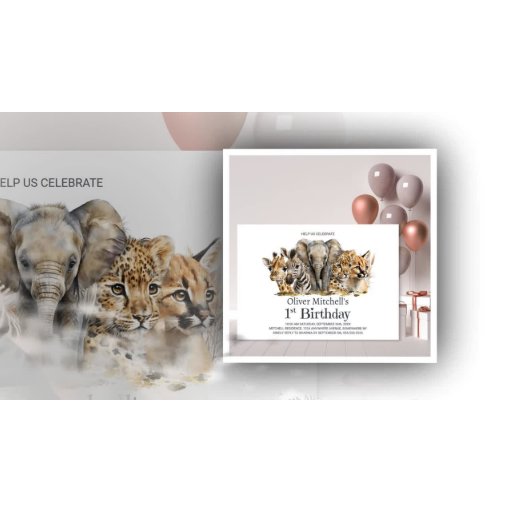 Celebre o seu primeiro aniversario e convide seus amigos e entes queridos para o seu primeiro aniversario com este convite de aniversário africano de animais safari. O texto personalizável permite que você adicione facilmente seu nome, data e hora da celebração e as informações de RSVP. Uma variedade de tipos de papel e estilos de canto estão disponíveis para seus convites exclusivos, juntamente com a opção de download se você preferir um formato digital.