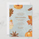 Convites de festas de primeiro aniversario de outono para bebê com ilustração simples das folhas do outono, abóbora laranja, cupcake, rosquinha e especiarias, como palito de canela ou anis, sobre fundo texturizado azul. A parte de trás apresenta a imagem da textura ruótica de madeira. Personalize facilmente com os detalhes da sua festa, cores e fontes favoritas.