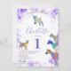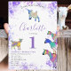 Sua primeira comemoração de aniversário com esta divertida coleção de ilustrações coloridas de cabra de cor d'água em rosa vibrante, roxo, azul, laranja, amarelo e aqua. Um primeiro aniversario de animais de criação bonitinho com cabras e cabras bebês em cabras. Este convite de festas divertido é fácil de personalizar para criar um convite de festas único adequado para crianças e amantes adultos de cabras. Exemplares originais de cabra psicodélica, de temo roxo colorida, da artista Catherine Sweetman