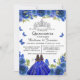 Celebre o encanto da sua Quinceañera com nosso convite floral azul real requintado, adornado com borboletas delicadas e um motivo de coroa real. O fundo azul poeirento define o tom perfeito para a ocasião,
