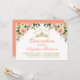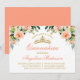 O Convite para Quinceanera Floral Branca de Pessegueira Elegante moderna inclui rosas de pêssego, flores brancas e folhas de verde botânico. Script de Caligrafia. Dourada Coroa Tiara.
