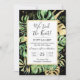 Este convite de recepção de casamento tropical elegante apresenta folhas de palmeira, philodendron e samambaia em verde e dourado em um fundo preto. Uma moldura dourada elegante destaca o texto preto. Salpicos dourados acentuam este design botânico exótico e trazem um toque de capricho moderno ao convite. "Nós Amarrámos o Nó!" junto com os nomes da noiva e do noivo estão apresentados no topo. Os detalhes dos votos de casamento e a localização e data da recepção estão detalhados abaixo. As informações de RSVP estão no verso do convite.