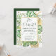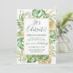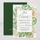 Este convite de celebração de casamento com fuga romântica tropical elegante apresenta folhas de palmeira, filodendro e samambaia em verde e dourado. Uma moldura dourada elegante destaca o texto em verde escuro. Salpicos dourados acentuam este design botânico exótico e trazem um toque de modernidade e capricho ao convite. "Vamos Celebrar!" junto com os nomes dos recém-casados estão apresentados no topo. Os detalhes dos votos de casamento e da recepção estão embaixo. As informações de RSVP estão no verso do convite.