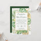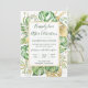 Este convite de recepção de casamento tropical elegante apresenta folhas de palmeira, filodendro e samambaia em verde e dourado. Uma moldura dourada elegante destaca o texto em verde escuro. Salpicos dourados acentuam este design botânico exótico e trazem um toque de capricho moderno ao convite. "Celebração Feliz para Sempre" junto com os nomes da noiva e do noivo estão apresentados no topo. Os detalhes dos votos de casamento e a localização e data da recepção estão detalhados na frente. As informações de RSVP estão no verso do convite.