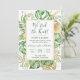 Este convite de recepção de casamento tropical elegante apresenta folhas de palmeira, filodendro e samambaia em verde e dourado. Uma moldura dourada elegante destaca o texto em verde escuro. Salpicos dourados acentuam este design botânico exótico e trazem um toque de capricho moderno ao convite. "Nós Amarrámos o Nó!" junto com os nomes da noiva e do noivo estão apresentados no topo. Os detalhes dos votos de casamento e a localização e data da recepção estão detalhados abaixo. As informações de RSVP estão no verso do convite.